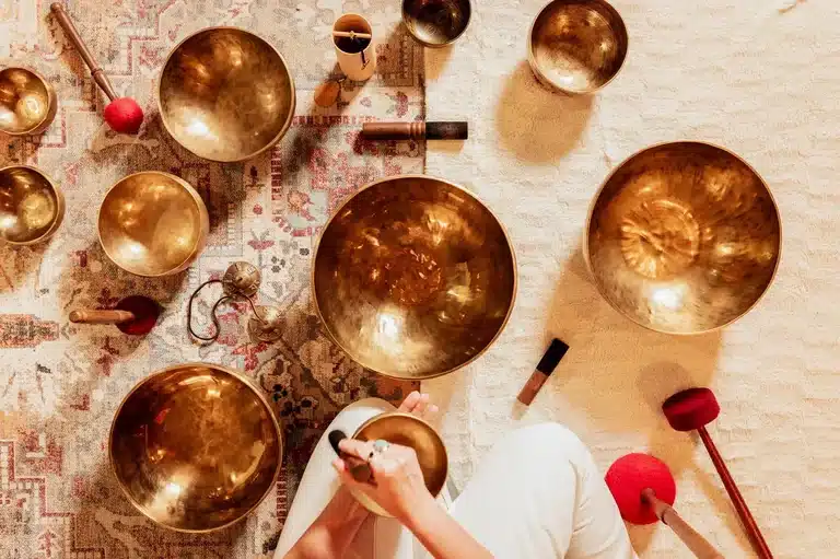 Les vibrations des bols aident à apaiser le système nerveux, relâcher les tensions et favoriser un meilleur sommeil. Beaucoup décrivent un recentrage et une sensation d’ancrage après la séance.